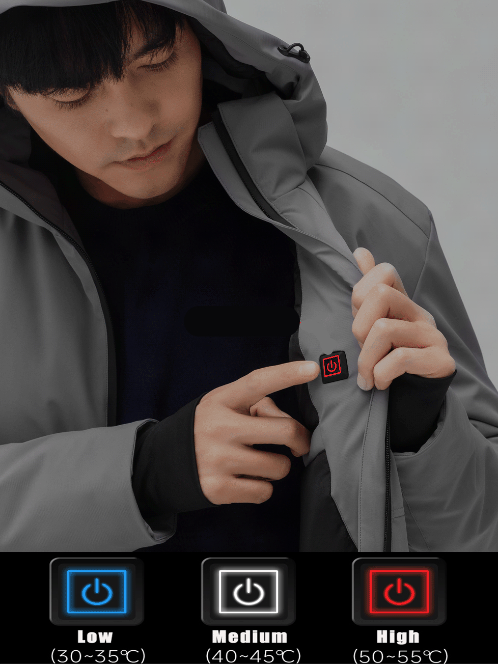 Grâce à sa batterie intégrée vous pourrez profiter de longues heures de chauffage si celle-ci est charger en amont de vos sorties. Son invention intelligente vous permet de gérer vous-même la température grâce au bouton situé sur le devant du blouson. Et ainsi de choisir entre 3 niveaux de chauffage, le minimum à 35°, le milieu à 45° et le maximum de chauffage est de 55°.
